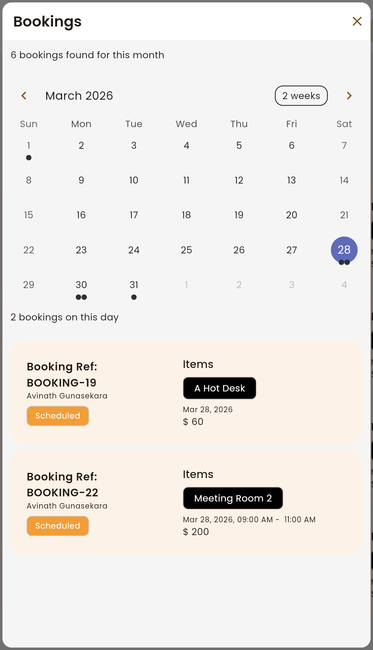 Browse the calendar to see exactly what's booked, when, and for whom. Filter by date range, spot availability at a glance, and drill into any booking for the full details — all without leaving the page.