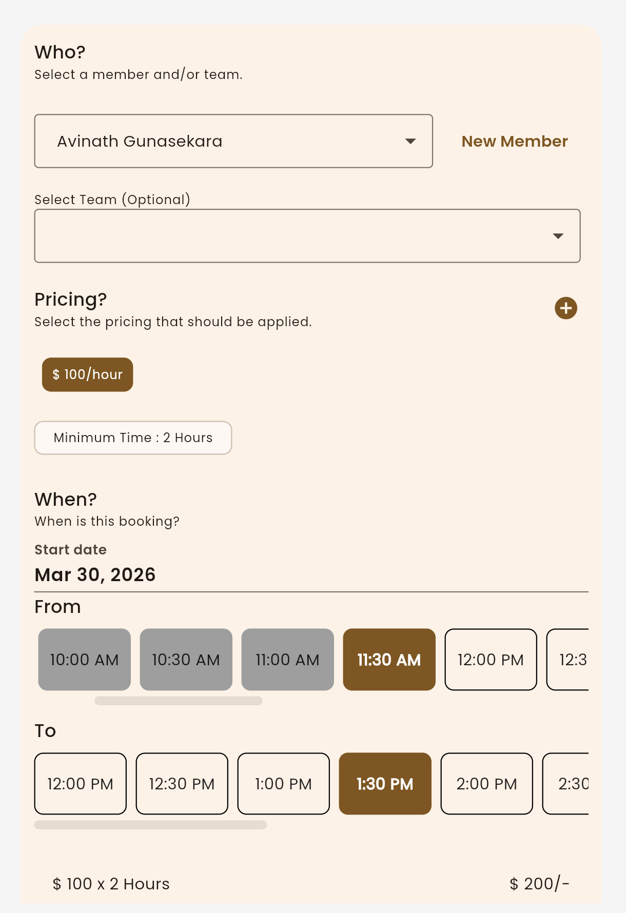 Pick the member, set the pricing rate, choose a start date, and select a time slot — all in one clean flow. No training required, no back-and-forth. Staff can create bookings on behalf of members in under a minute.